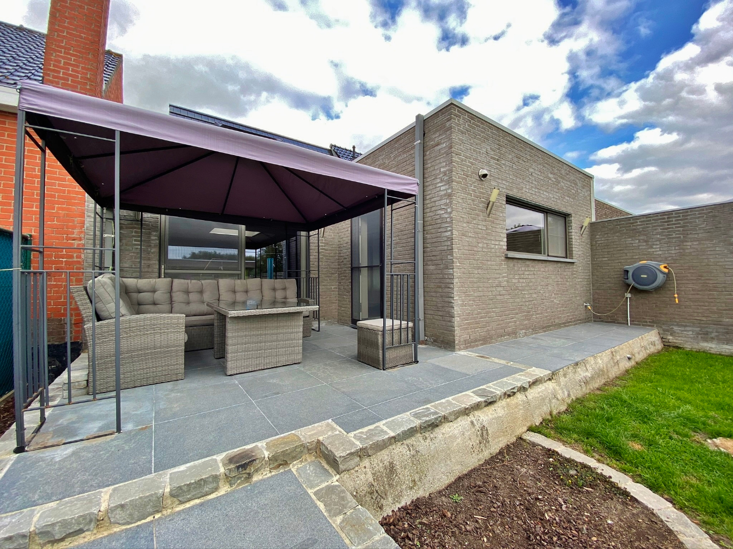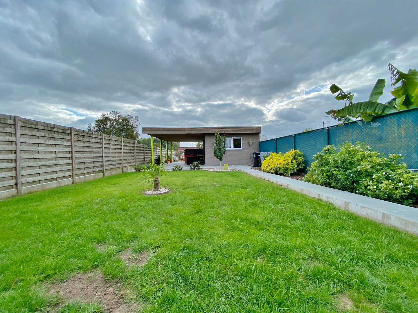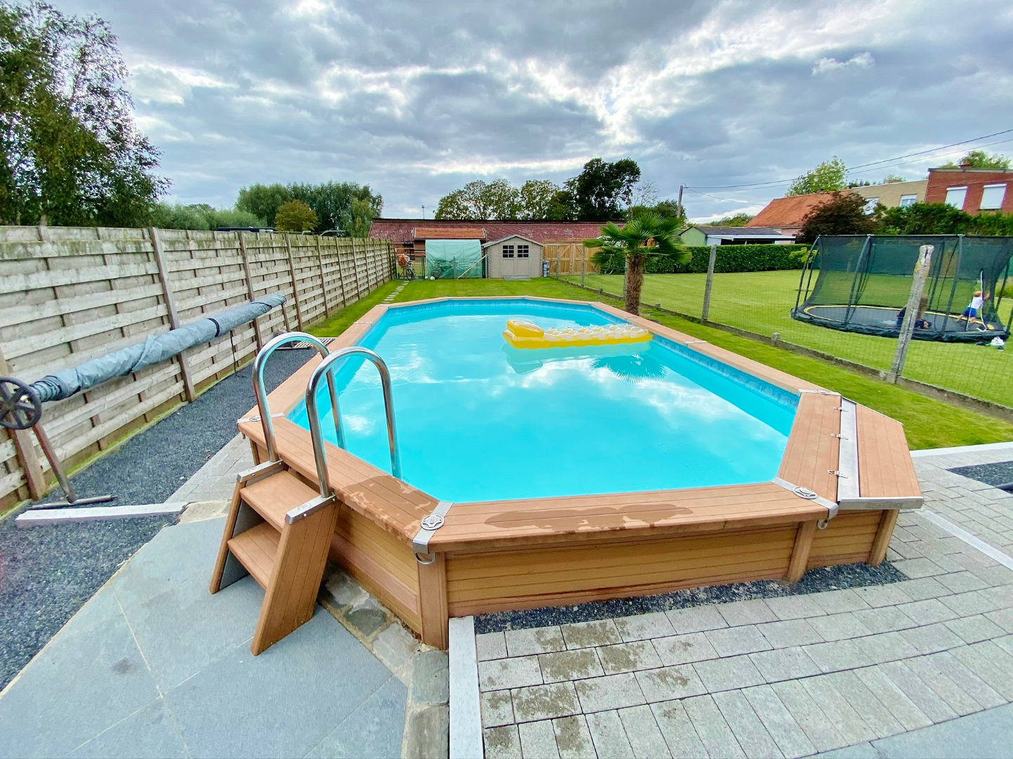 Buiten is een zuid-gerichte tuin met aangelegd terras, zwembad, tuinberging, serre en ruime buitenberging met extra overdekt terras (momenteel ingericht als aparte studio met ingerichte keuken, kan ook perfect gebruikt worden als pool house/bergplaats). Vooraan is tevens een ruime oprit voor twee wagens.