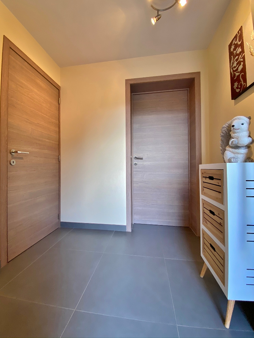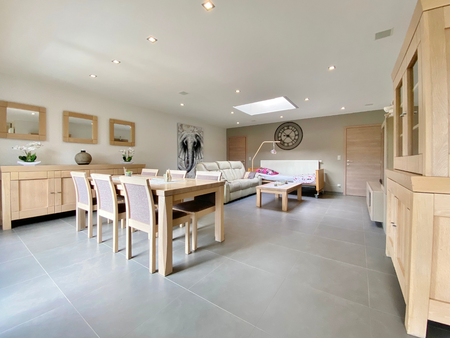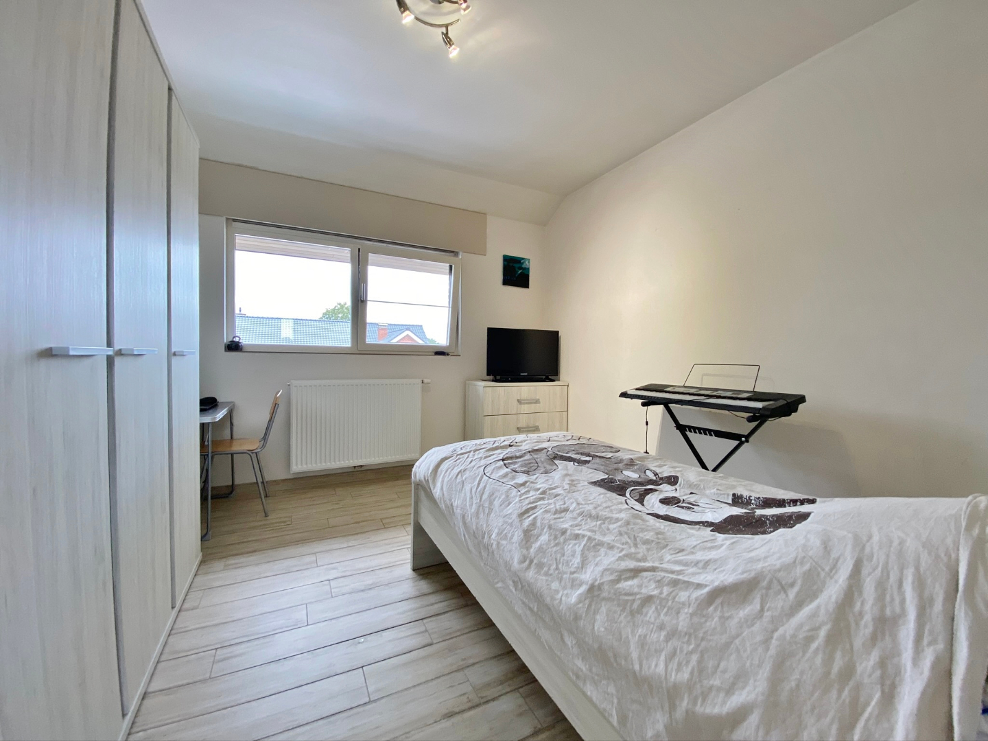 Deze instapklare woning werd in 2015 volledig vernieuwd en omvat een gelijkvloerse verdieping met inkom, apart toilet, ruime lichtrijke leefruimte met open volledig ingerichte keuken en aansluitende berging, badkamer met inloopdouche, bad, lavabomeubel en toilet, slaapkamer en garage. Op het eerste verdiep zijn 2 ruime slaapkamers. Er is tevens een volledig geïsoleerde zolder.