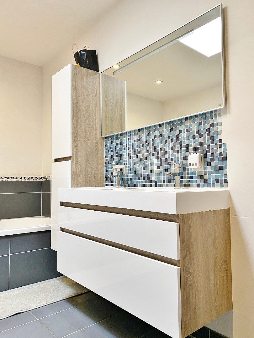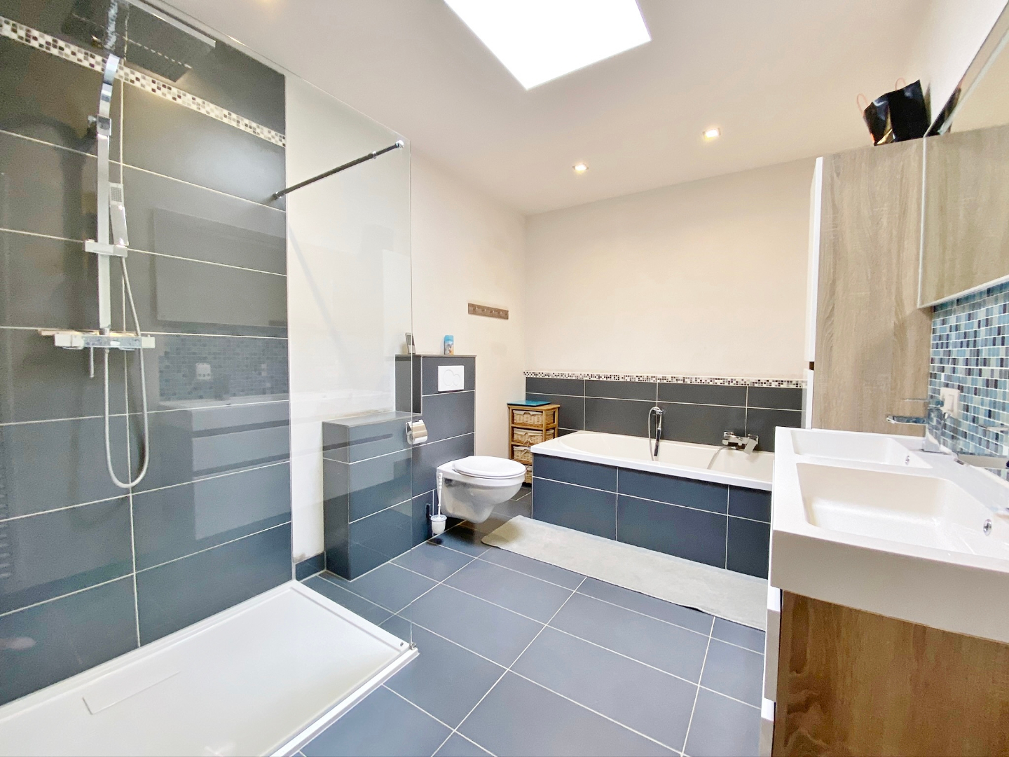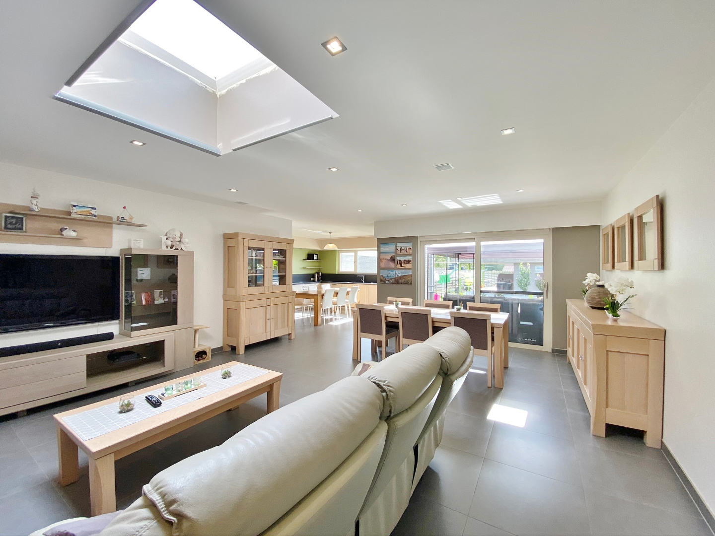 Deze instapklare woning werd in 2015 volledig vernieuwd en omvat een gelijkvloerse verdieping met inkom, apart toilet, ruime lichtrijke leefruimte met open volledig ingerichte keuken en aansluitende berging, badkamer met inloopdouche, bad, lavabomeubel en toilet, slaapkamer en garage. Op het eerste verdiep zijn 2 ruime slaapkamers. Er is tevens een volledig geïsoleerde zolder.