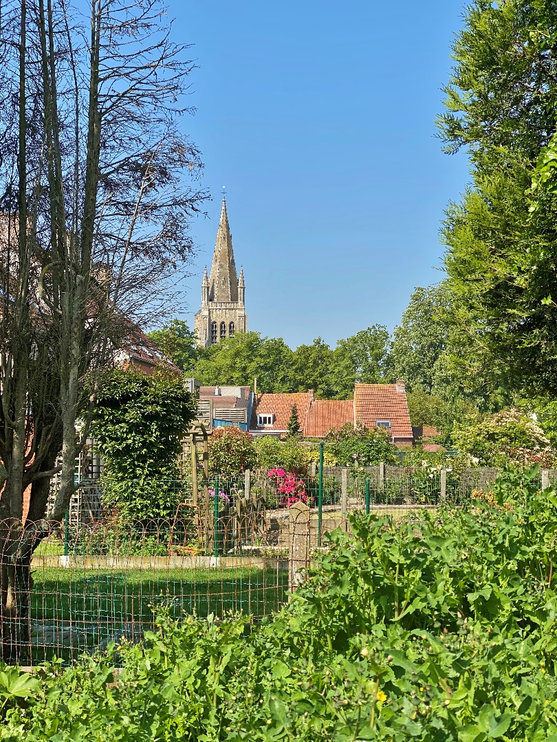 Buiten is een gezellige tuin met zicht op de Sint-Jacobskerk.