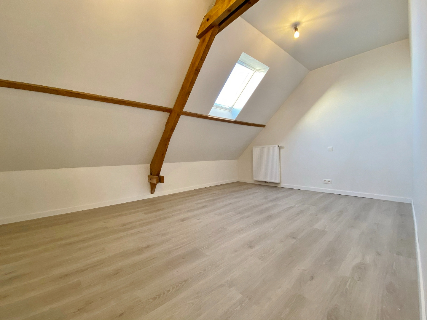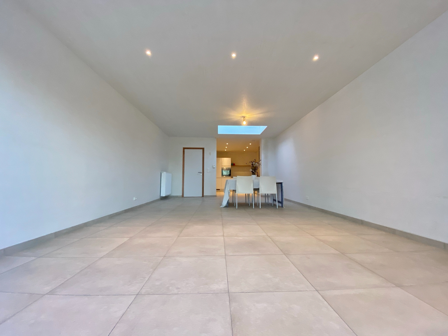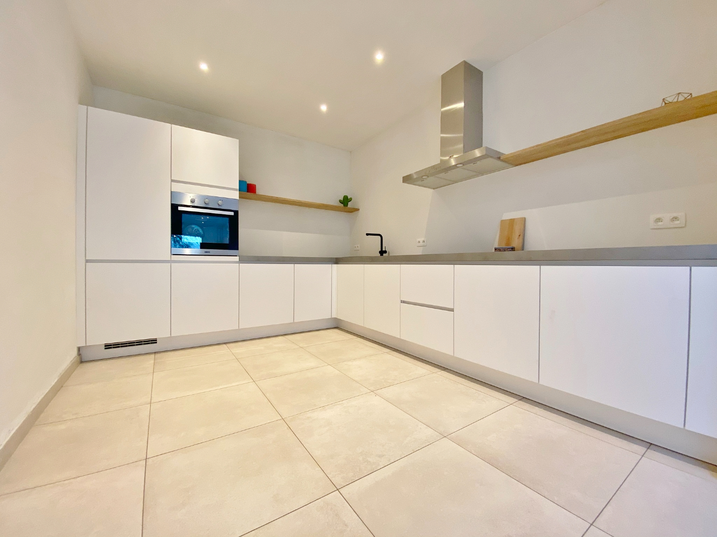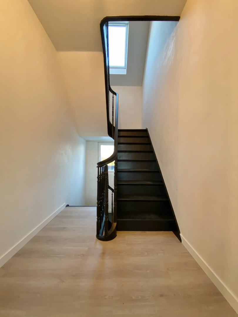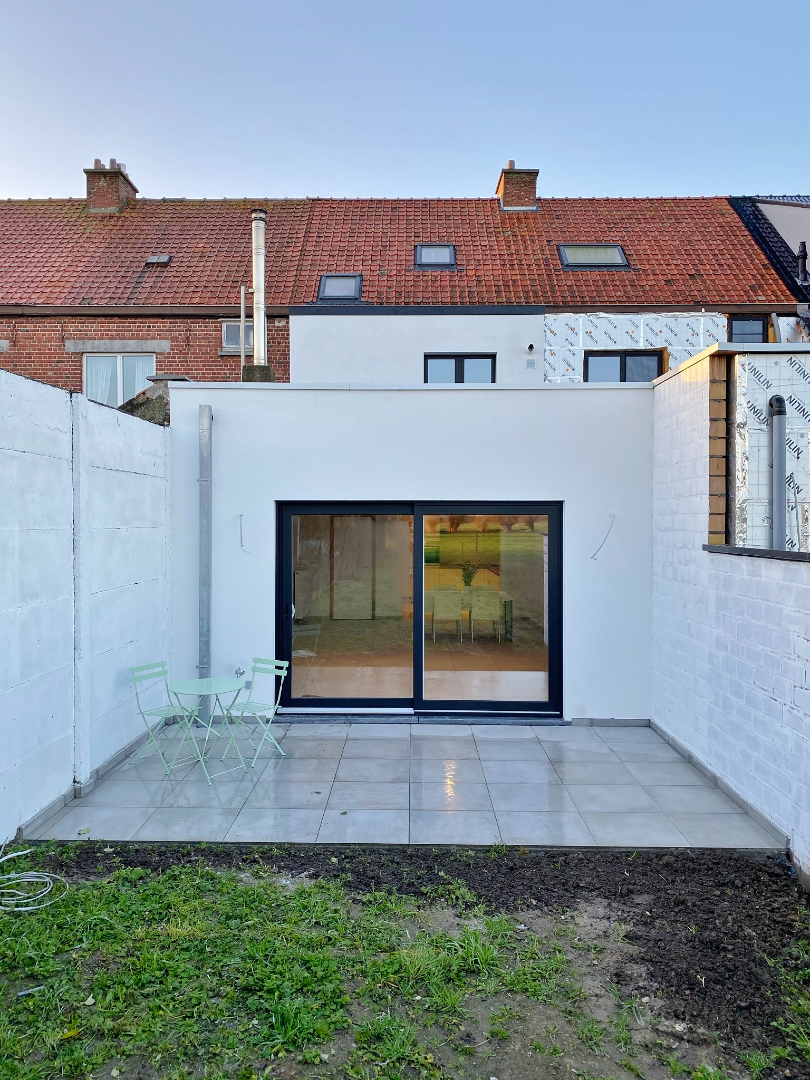 Deze woning werd volledig gerenoveerd en omvat een gelijkvloerse verdieping met inkom, bergruimte/bureau, toilet, ruime lichtrijke leefruimte met open volledig ingerichte keuken en zicht over de tuin. Op het eerste verdiep zijn een ruime slaapkamer en badkamer met inloopdouche, ligbad, dubbel lavabomeubel en toilet. Op het tweede verdiep zijn 2 slaapkamers.