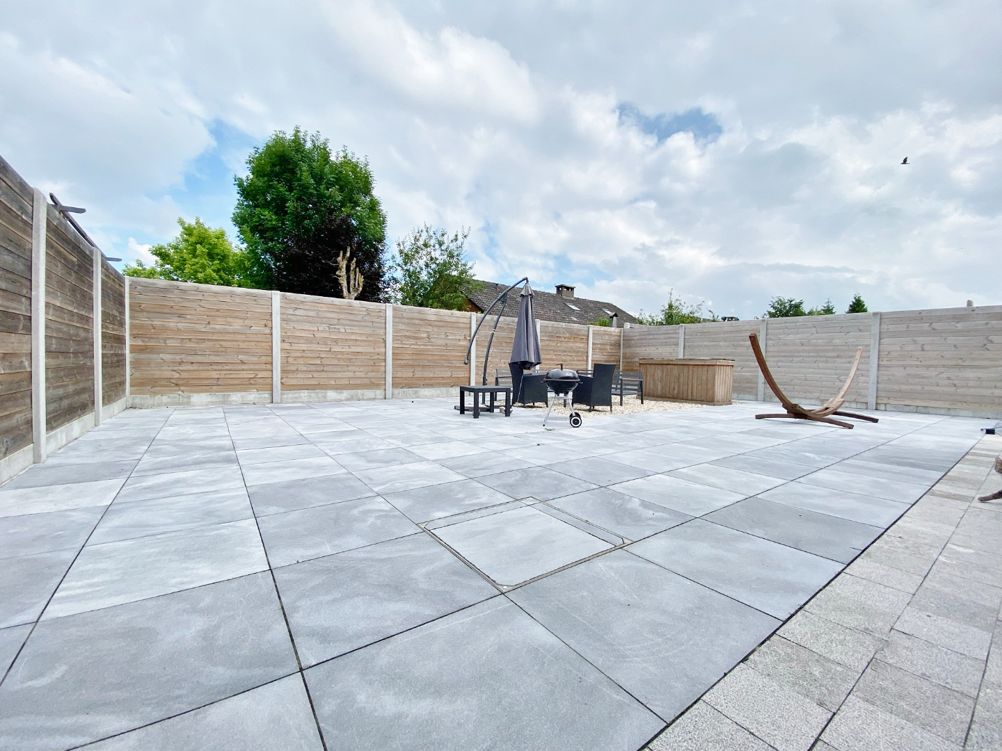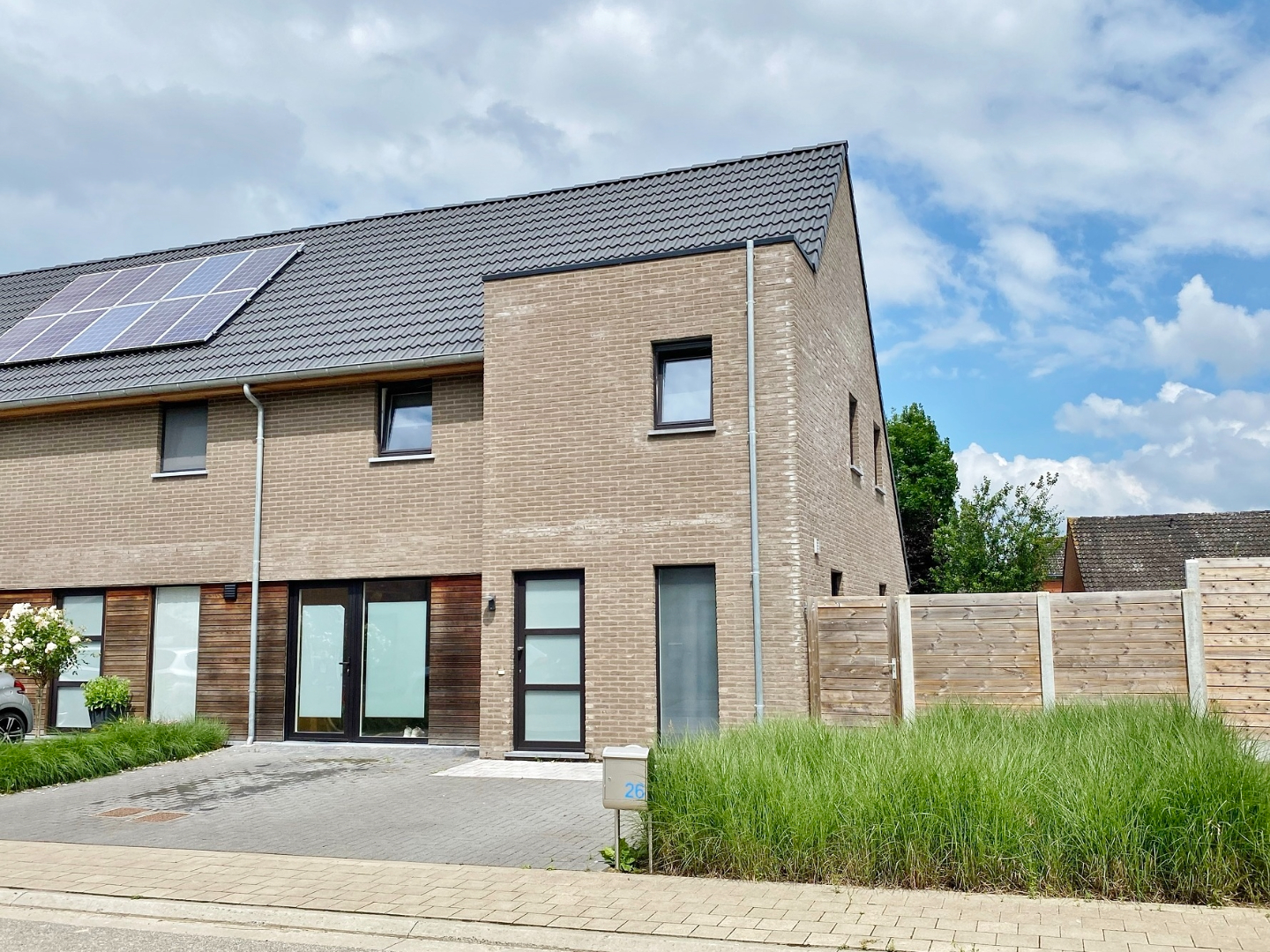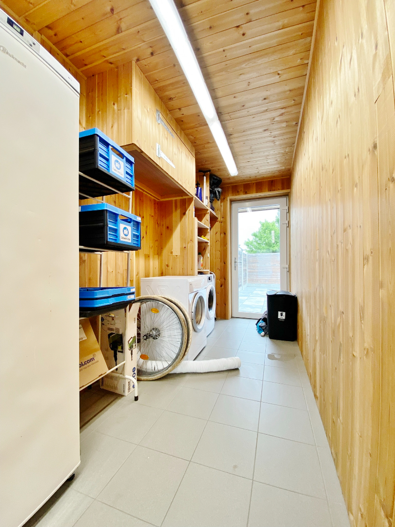 Buiten is vooraan een oprit voor twee wagens en achteraan een zonnige tuin. Deze werd zeer onderhoudsvriendelijk aangelegd.