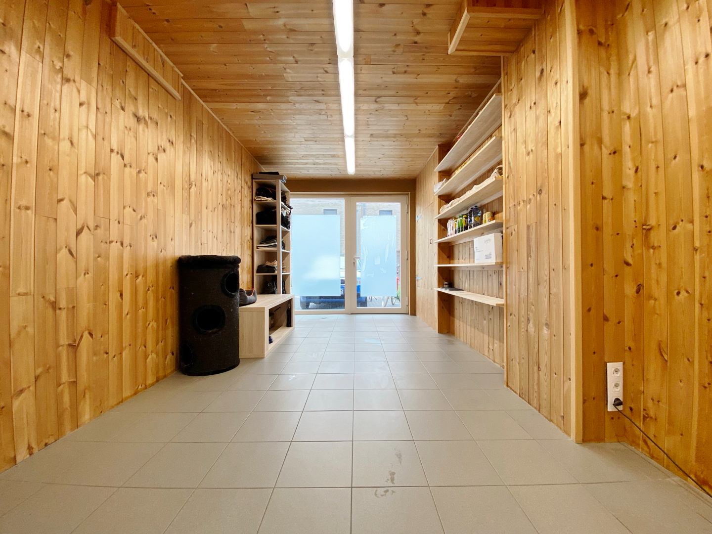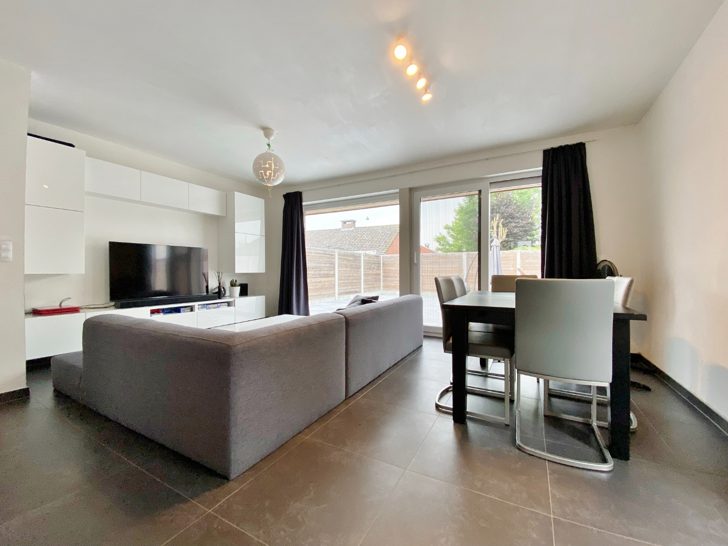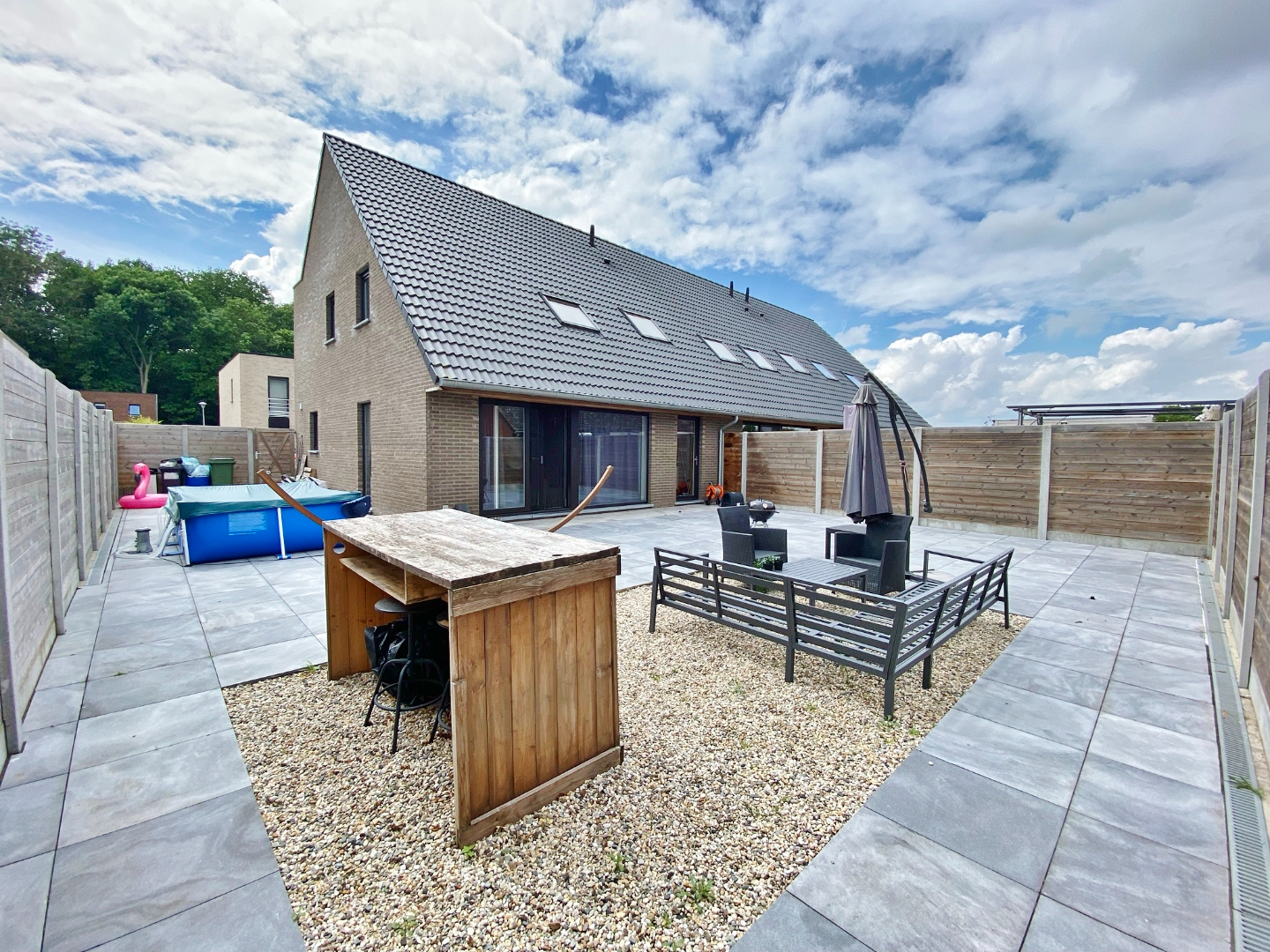 Buiten is vooraan een oprit voor twee wagens en achteraan een zonnige tuin. Deze werd zeer onderhoudsvriendelijk aangelegd.