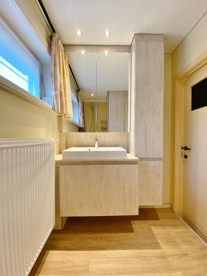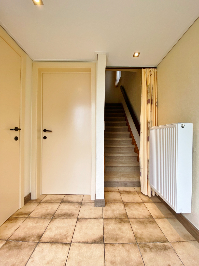 Deze rustig gelegen woning omvat een gelijkvloerse verdieping met een inkomhal, gastentoilet, ruime leefruimte met veel lichtinval, keuken met ingebouwde toestellen en aangenaam uitzicht op de tuin en een ruime garage met bijhorende wasplaats. De eerste verdieping bestaat vervolgens uit 3 slaapkamers (waarvan 2 met ingebouwde kasten) en een badkamer met inloopdouche, toilet en badkamermeubel.