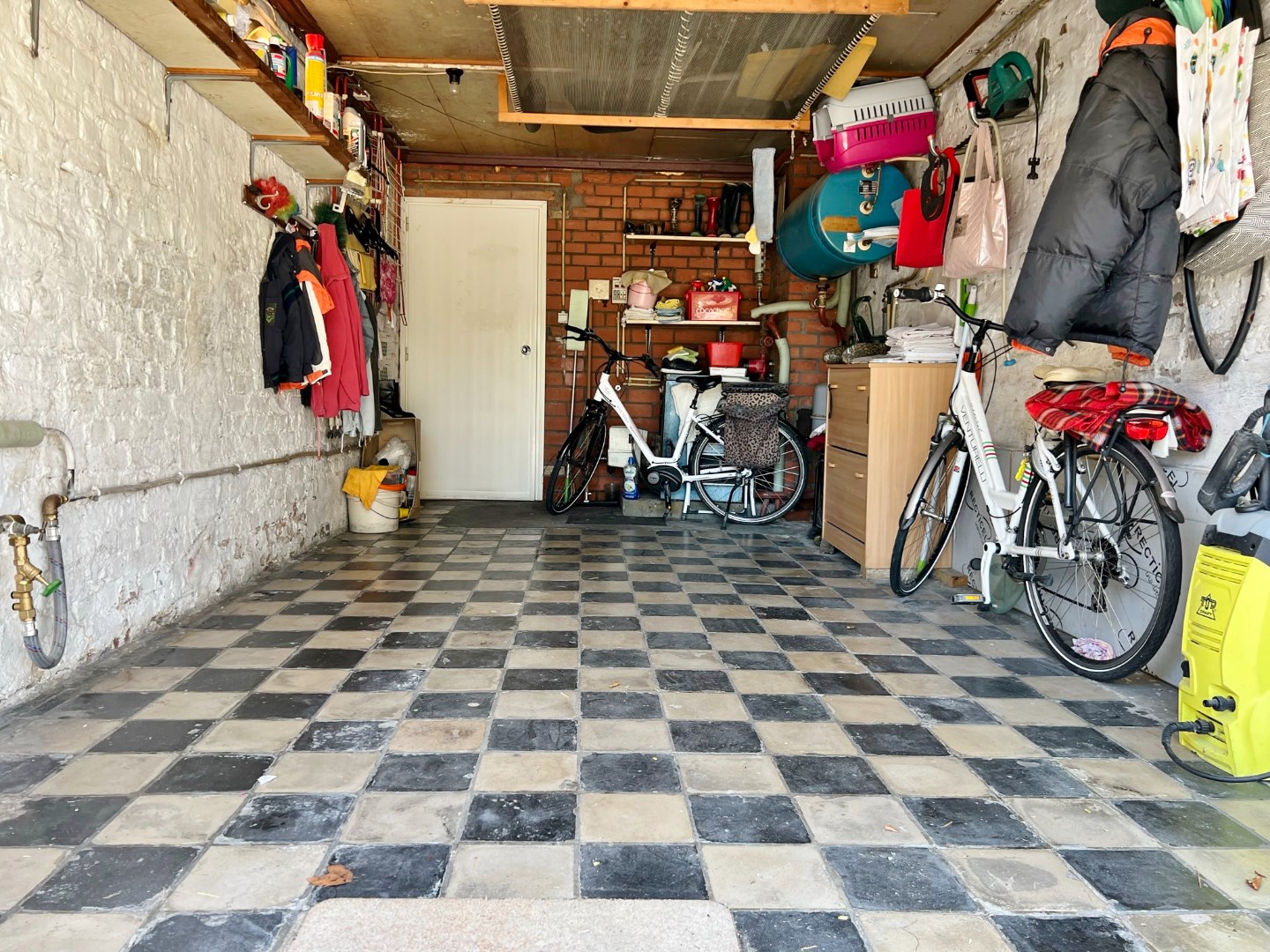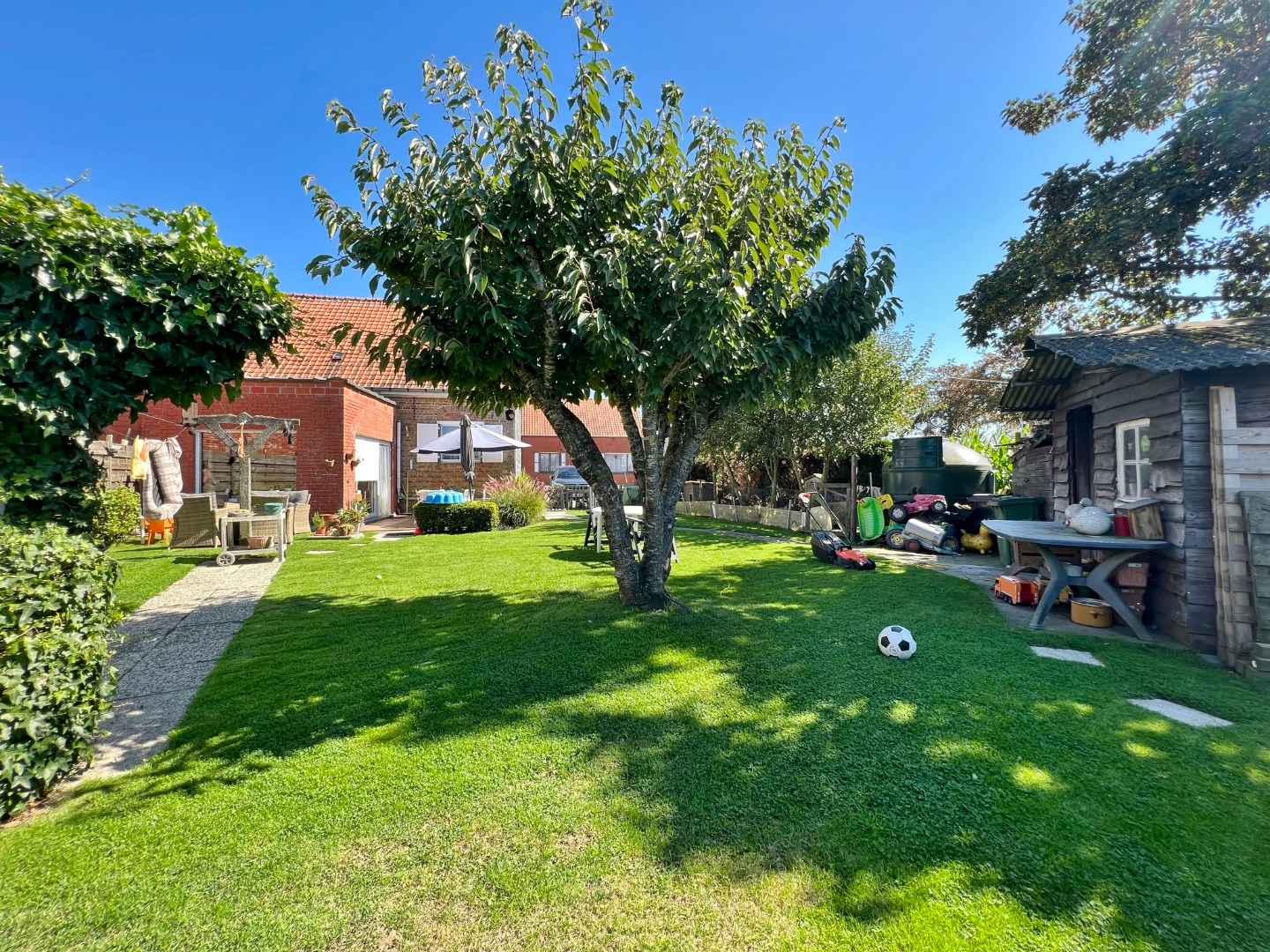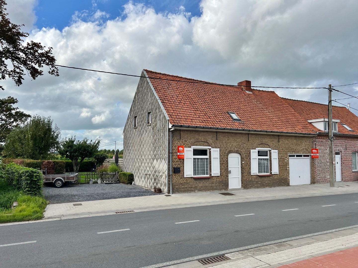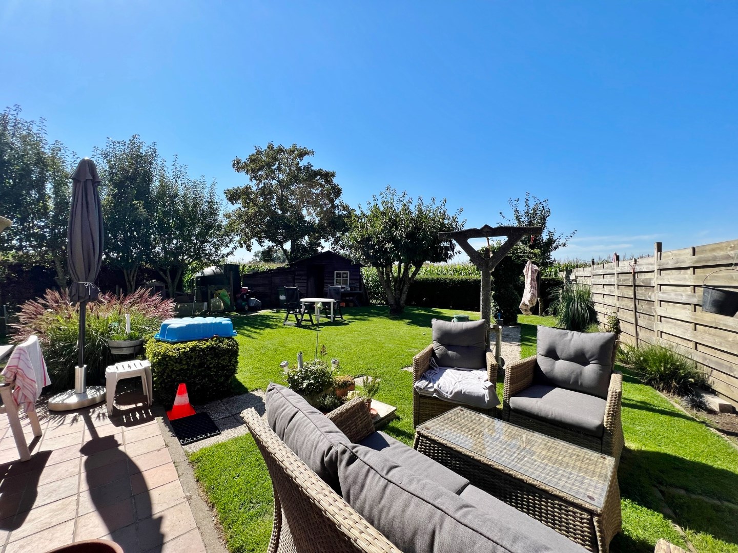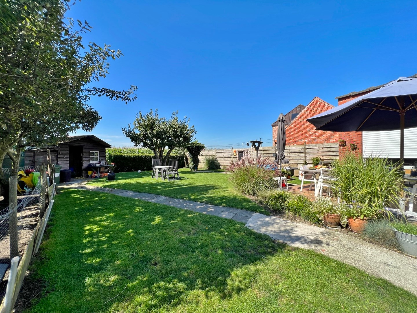 Buiten is een volledig afgesloten zuidwest gerichte tuin met zicht over de velden en vooraan een oprit voor 2 wagens.