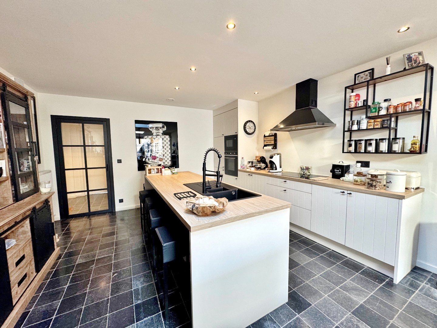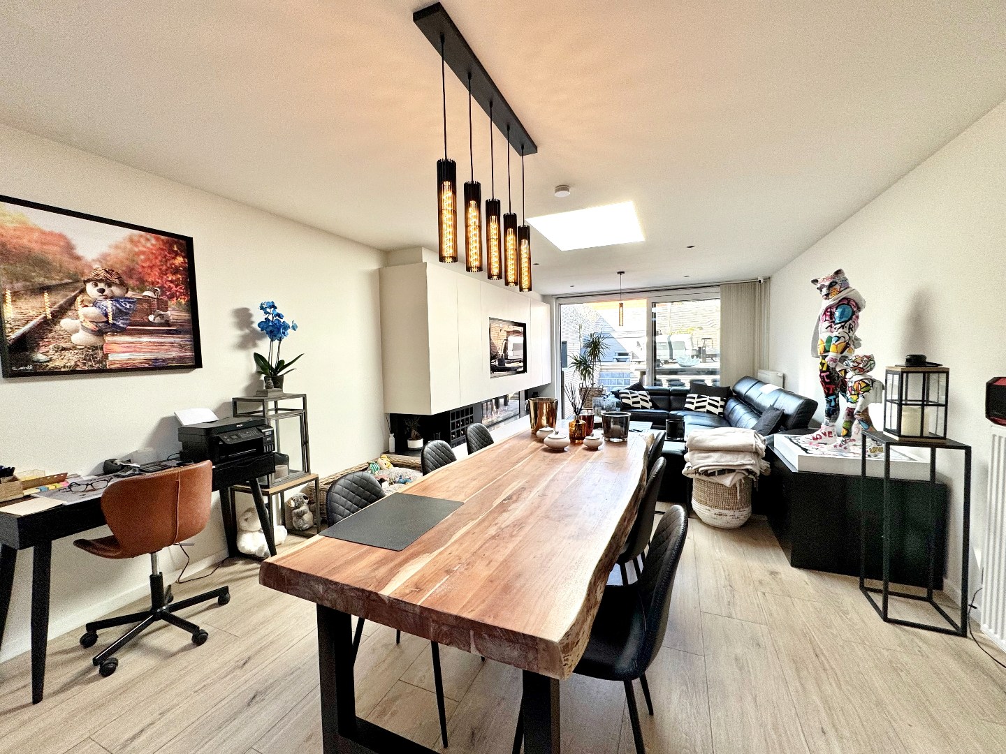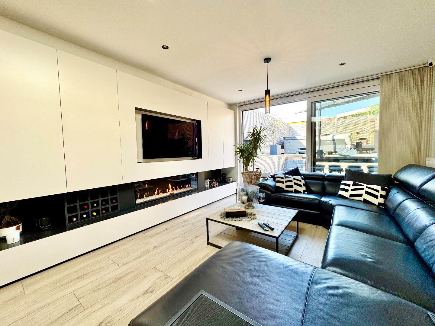 Via het ruime inkomportaal (6,8 m²) met vestiaire, open traphal en gastentoilet bereik je de lichtrijke leefruimte (53 m²) deze biedt een gezellige zithoek met een moderne gashaard en een ruime eethoek met zicht op de tuin. De open keuken met eiland is volledig uitgerust met kwalitatieve SMEG-toestellen. Aansluitend bevindt zich de ruime garage (22,4 m²) met automatische sectionaalpoort en een praktische wasberging.