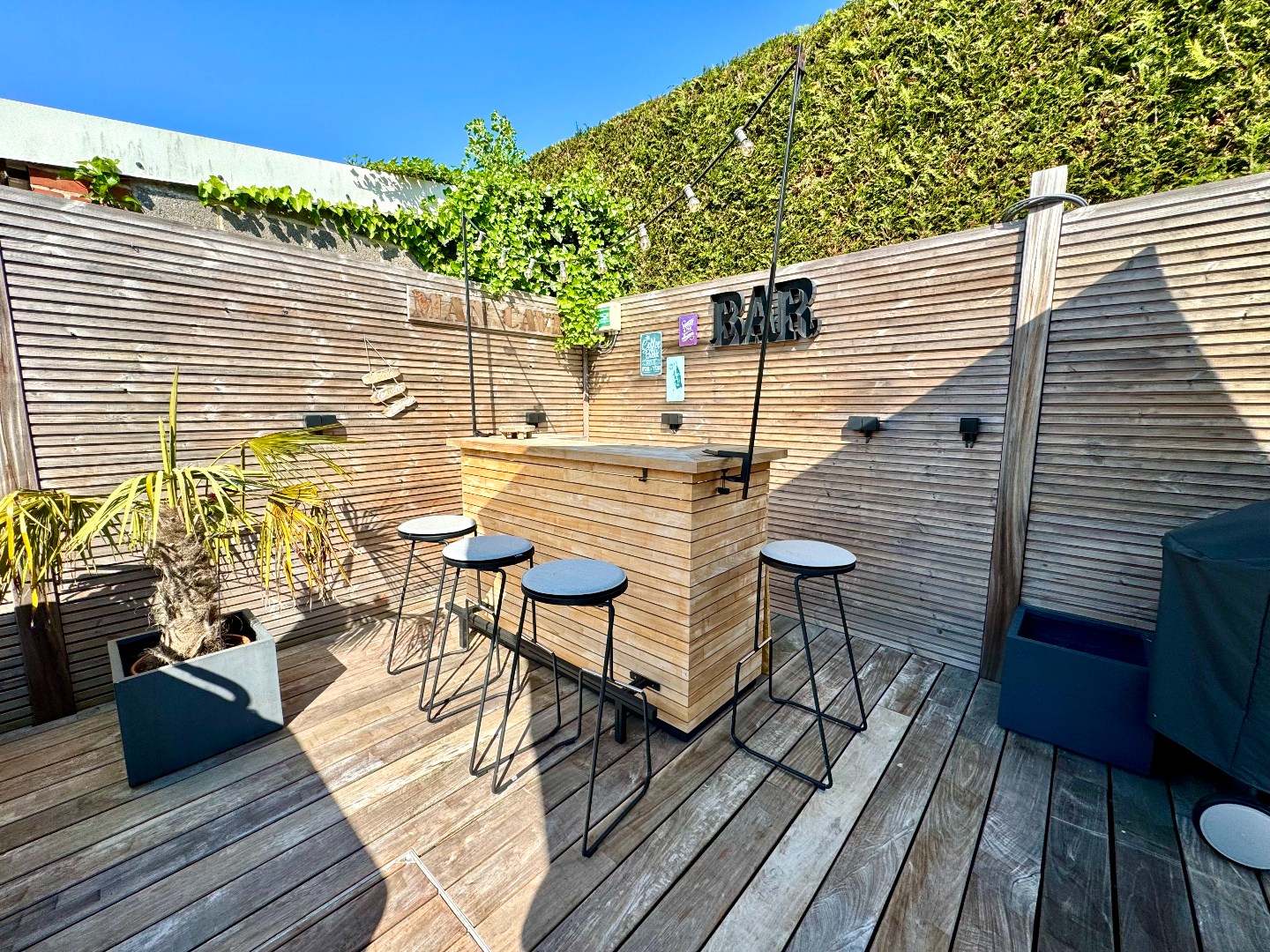 Aangelegde zonnige tuin met terras, bereikbaar via zijweg.