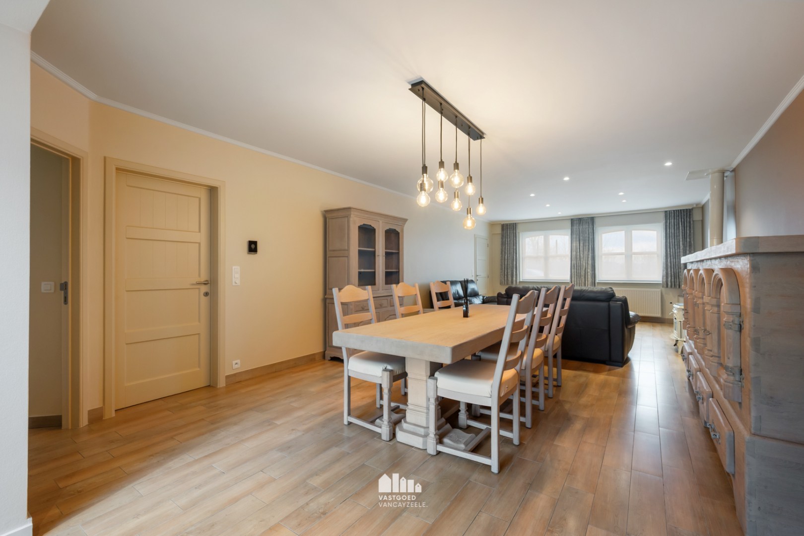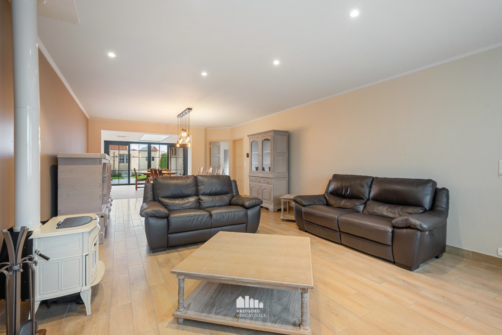 Op het gelijkvloers kom je binnen via de inkomhal met gastentoilet. De ruime en lichtrijke leefruimte met eet- en zithoek is voorzien van een gezellige houtkachel. Aansluitend bevindt zich een nieuwe uitbouw met indrukwekkende glaspartij die langs beide zijden kan opengeschoven worden – zo wordt binnen één met de tuin.