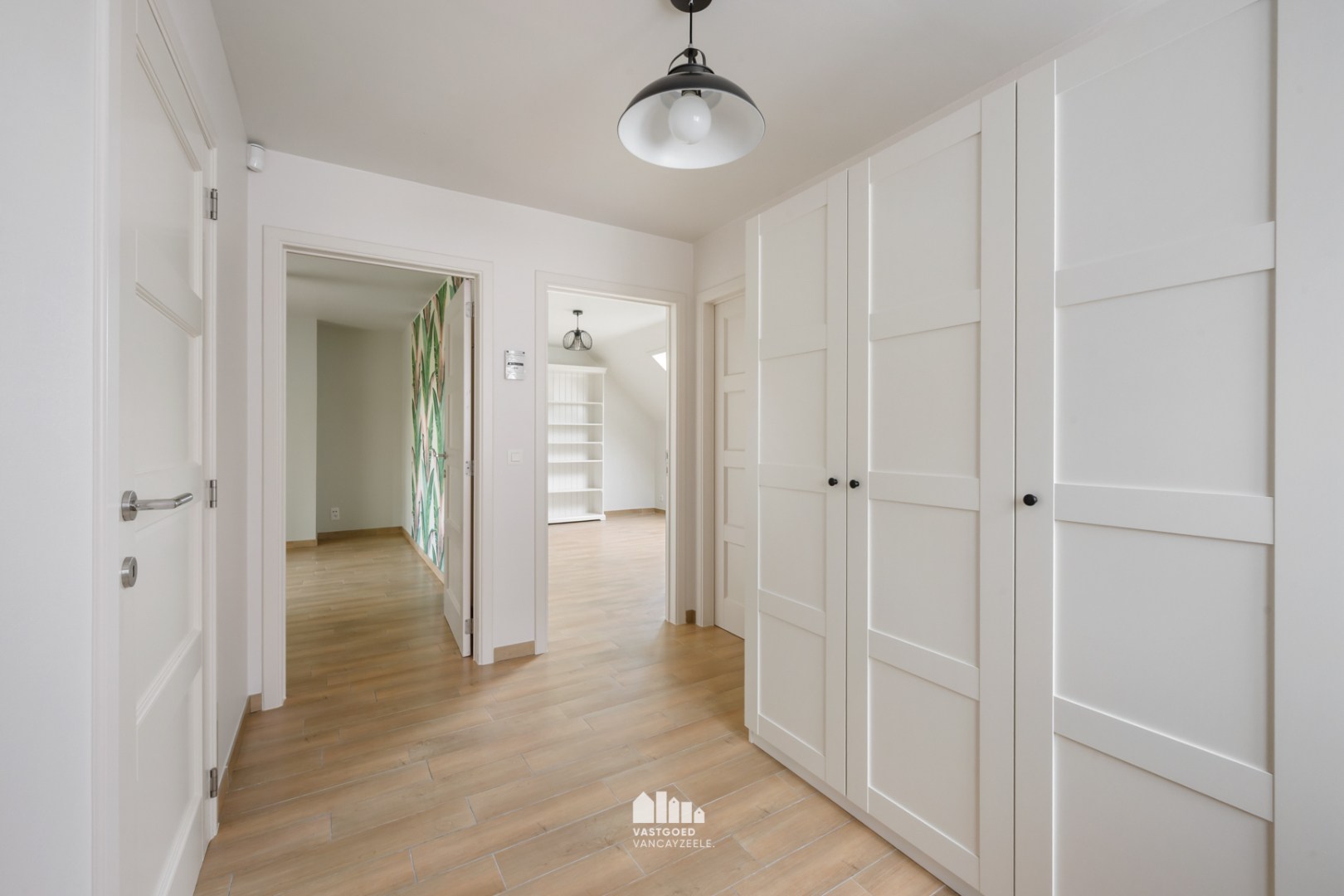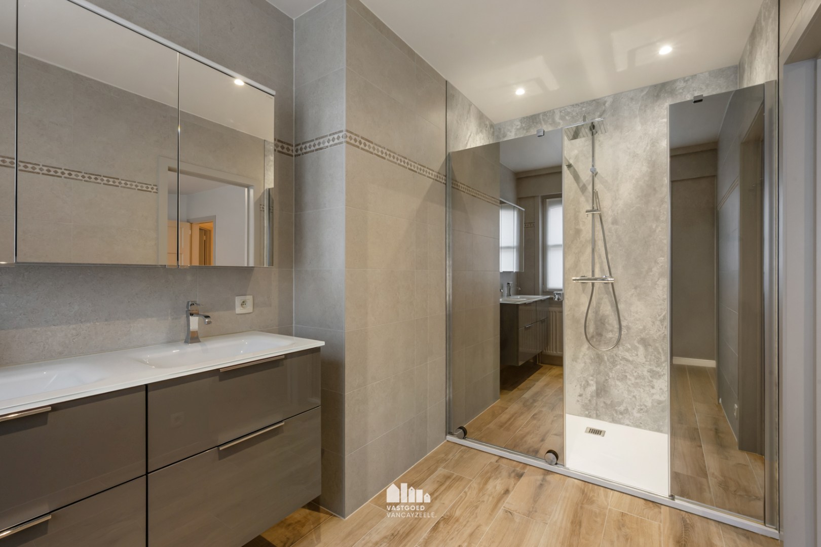 Daarnaast bevindt zich op het gelijkvloers nog een slaapkamer met ingemaakte kasten en een volledig vernieuwde badkamer met inloopdouche en dubbele wastafel.