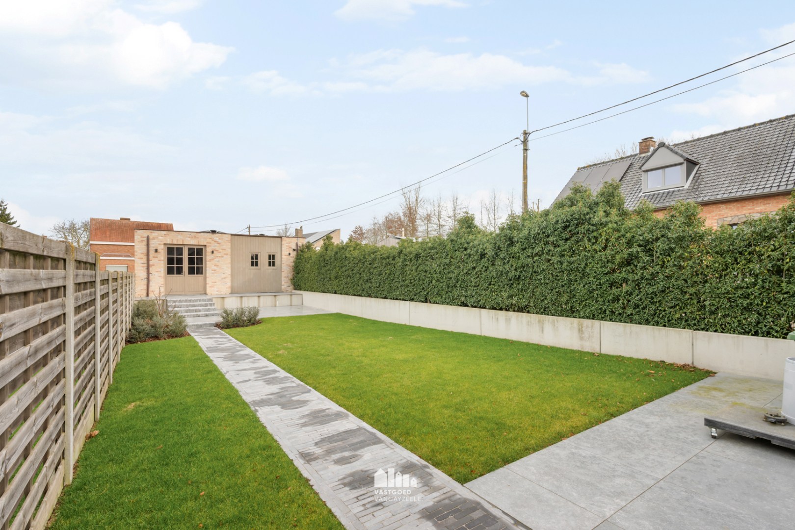 De woning beschikt over een volledig aangelegde en omheinde tuin, ideaal voor kinderen en huisdieren. Achteraan bevindt zich een dubbele garage wat zorgt voor extra comfort en bergruimte.