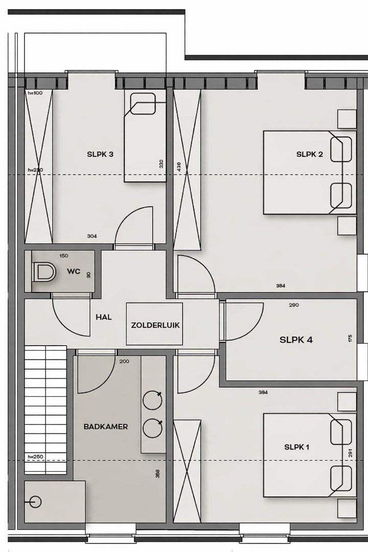Op de eerste verdieping bevinden zich vier slaapkamers, een badkamer met lavabomeubel, douche en ligbad, evenals een apart tweede toilet. Via een zolderluik is er bovendien toegang tot een extra zolderruimte, ideaal als bijkomende bergruimte.