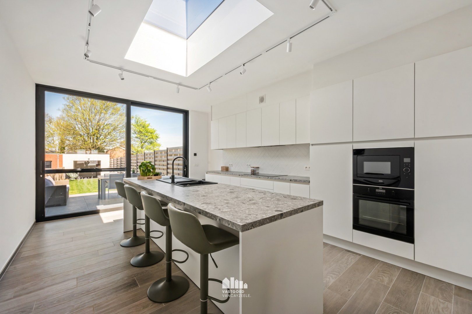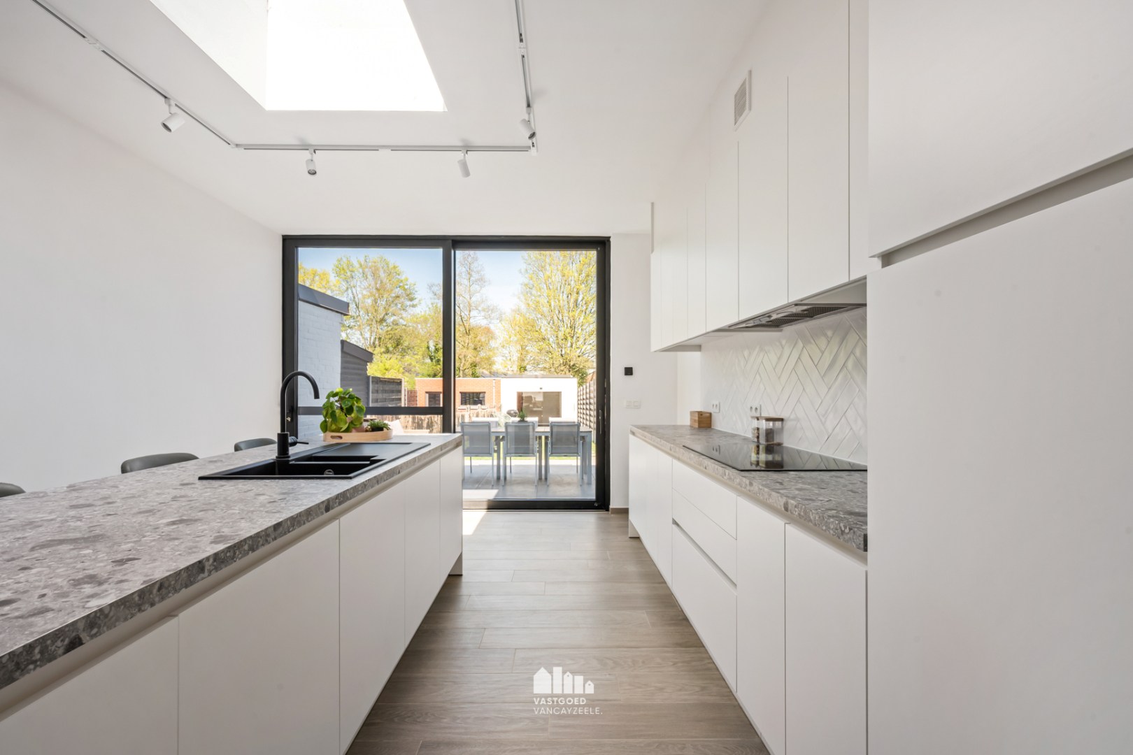 De hoogwaardige open keuken is volledig uitgerust met alle toestellen en vormt het hart van de woning. Dankzij het grote schuifraam tussen keuken en terras ontstaat er een mooie connectie tussen binnen en buiten en geniet u van een aangename lichtinval en zicht op de tuin.