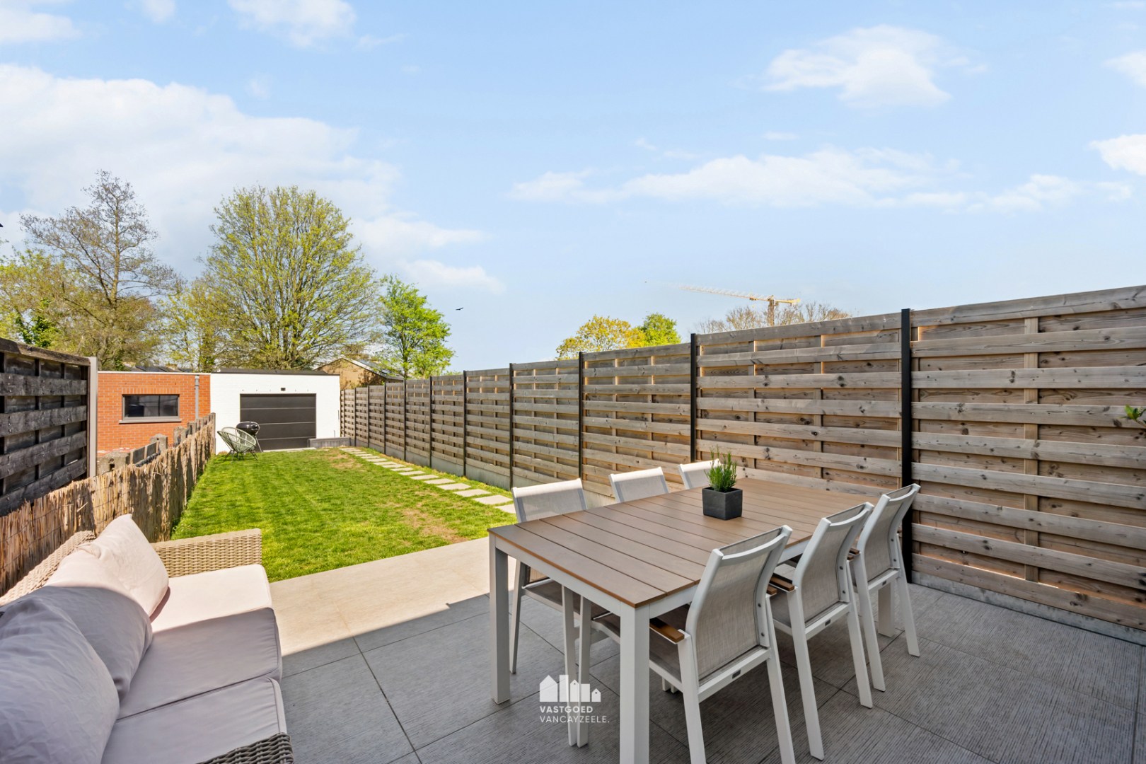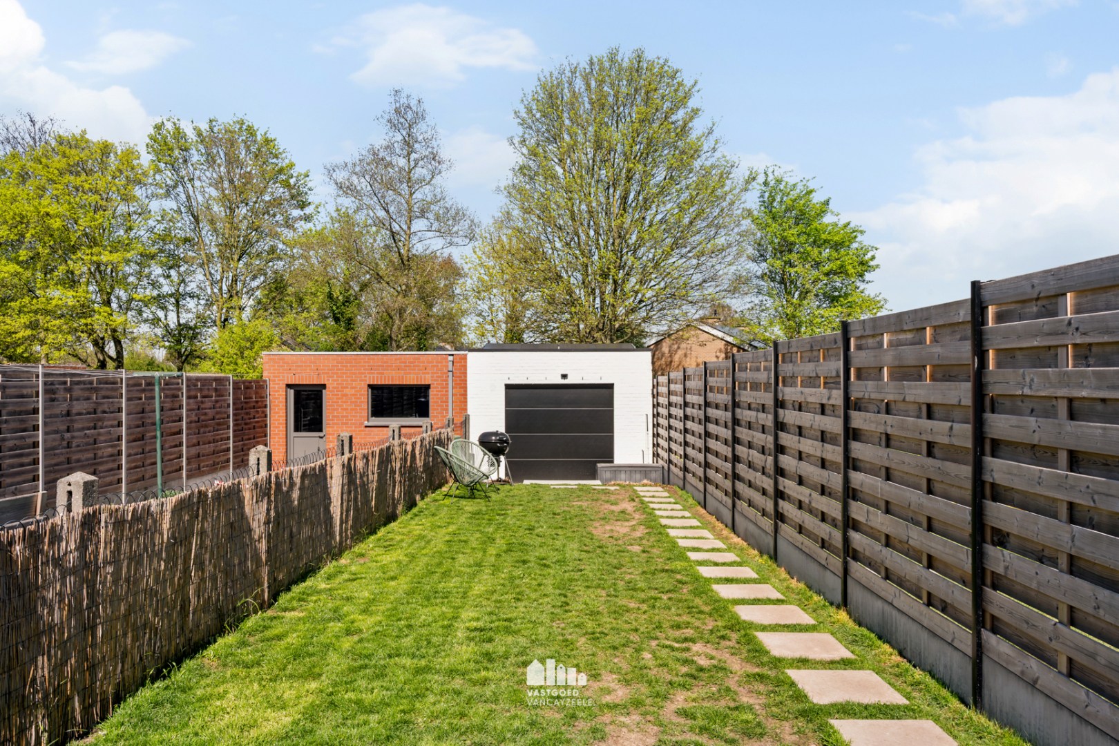Buiten geniet u van een ruim terras en een zonnige tuin met stapstenen naar de garage. De dubbele poort aan de garage zorgt voor een handige uitweg achteraan, waar zich bovendien nog een extra parkeerplaats bevindt.