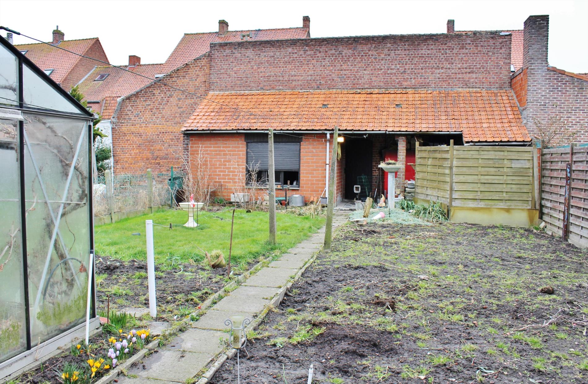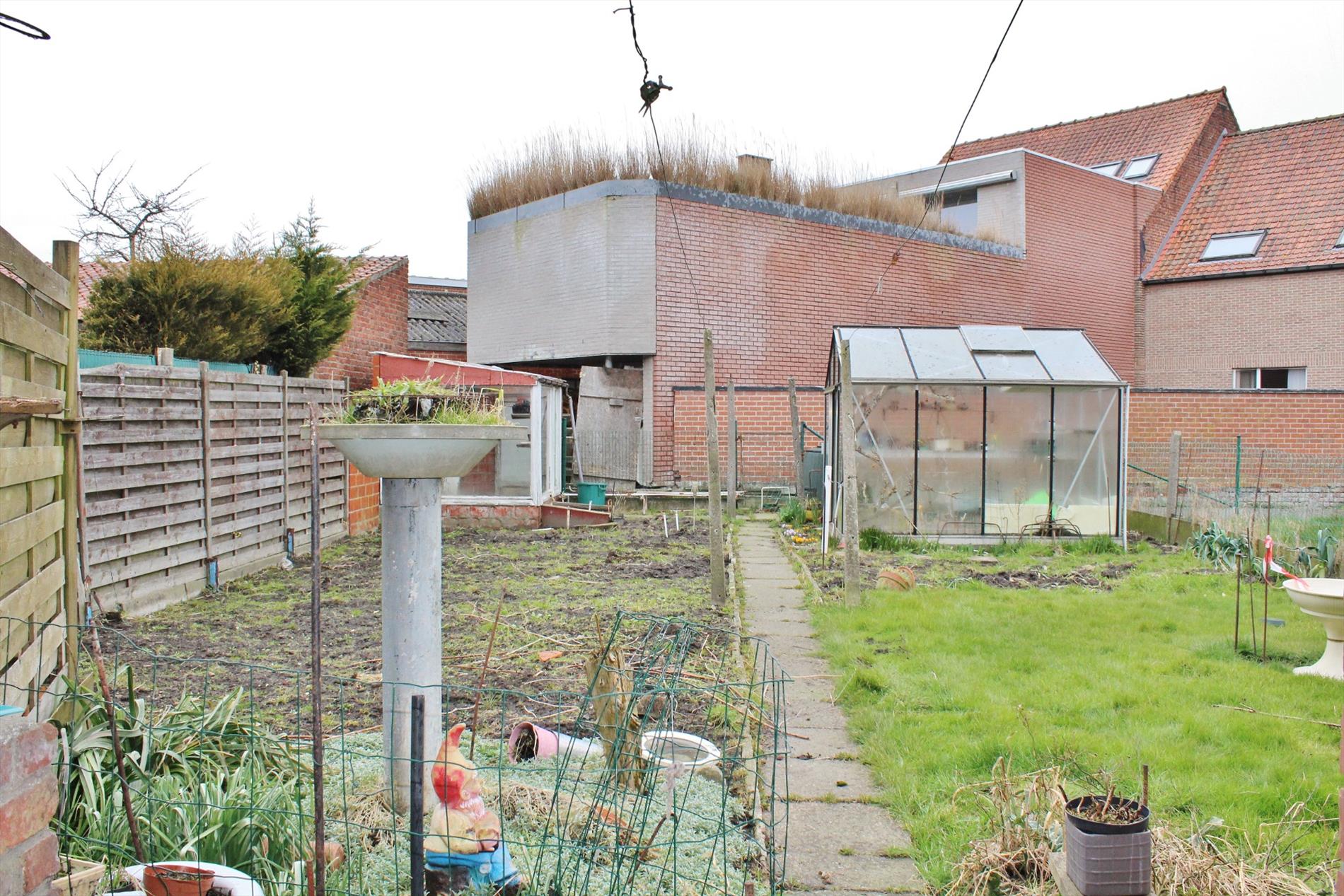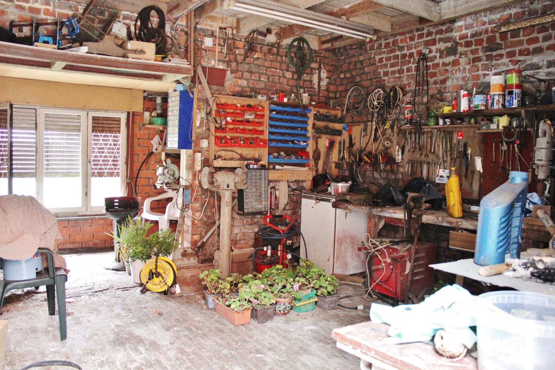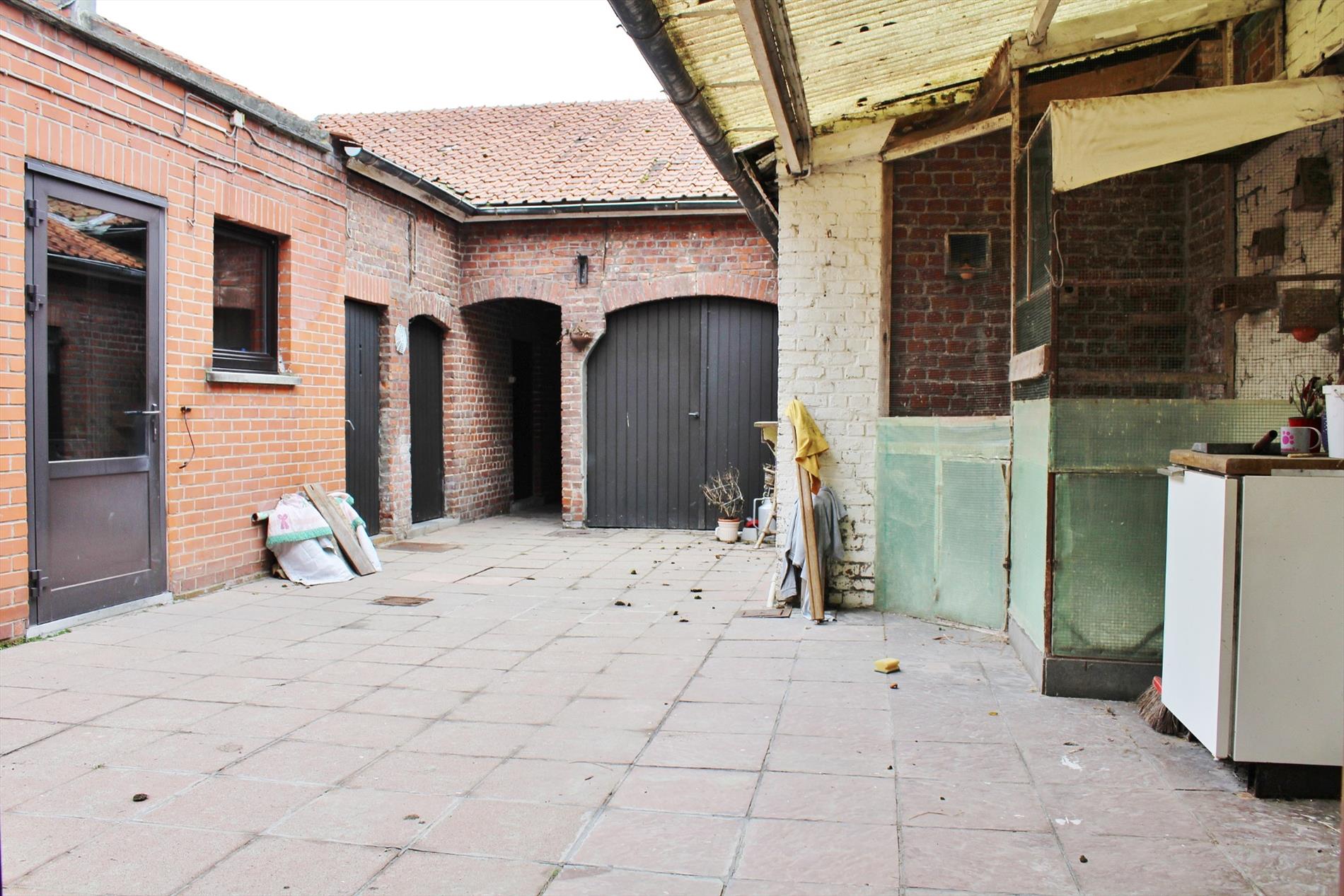 Buiten is er een gezellige binnenkoer met tal van buitenbergingen en een tweede garage. Deze is bereikbaar via de garage in de woning waar je kan doorrijden. Achter de binnenkoer ligt tevens een zonnige tuin met een uitweg ( 1m breed ).