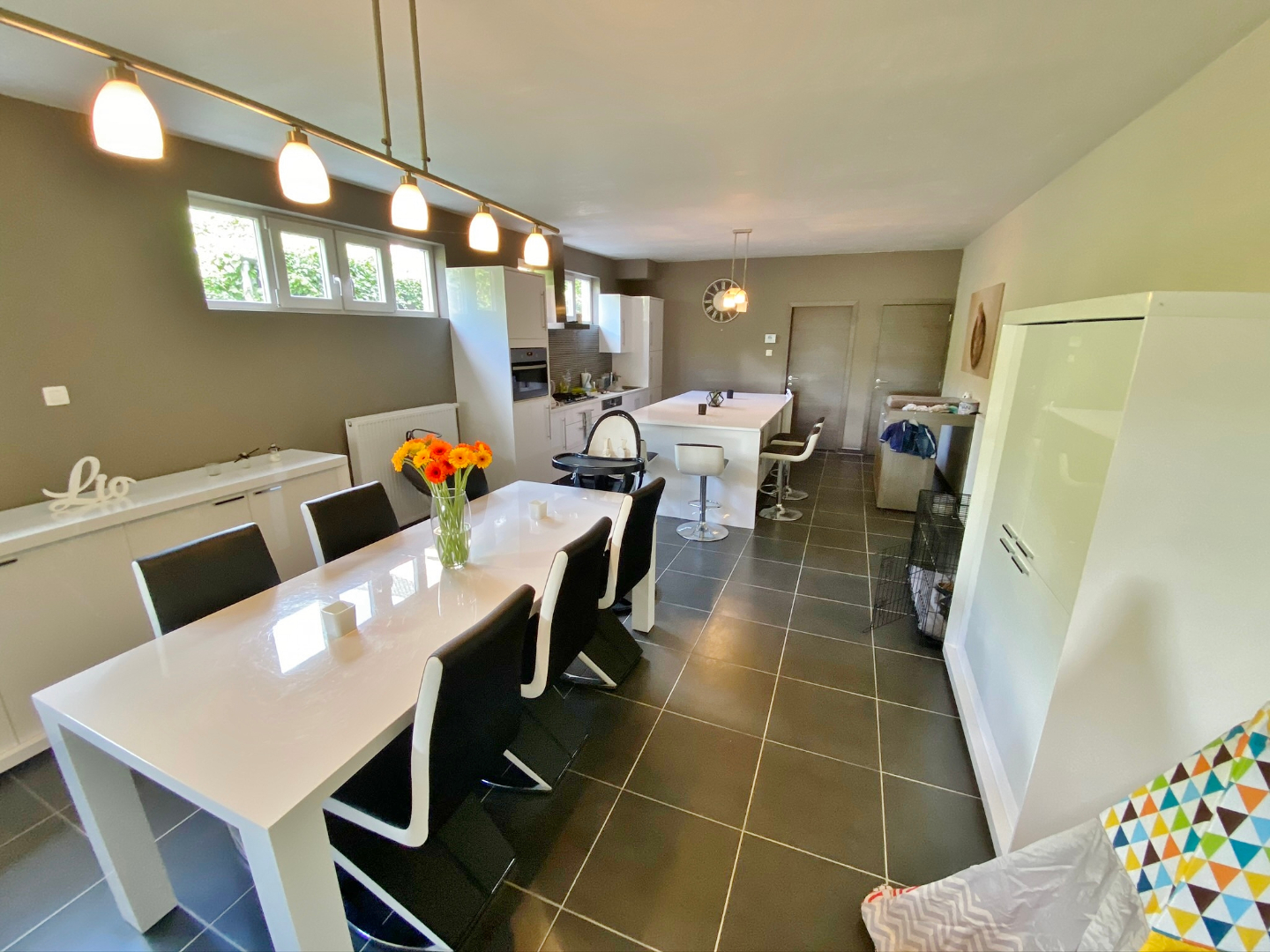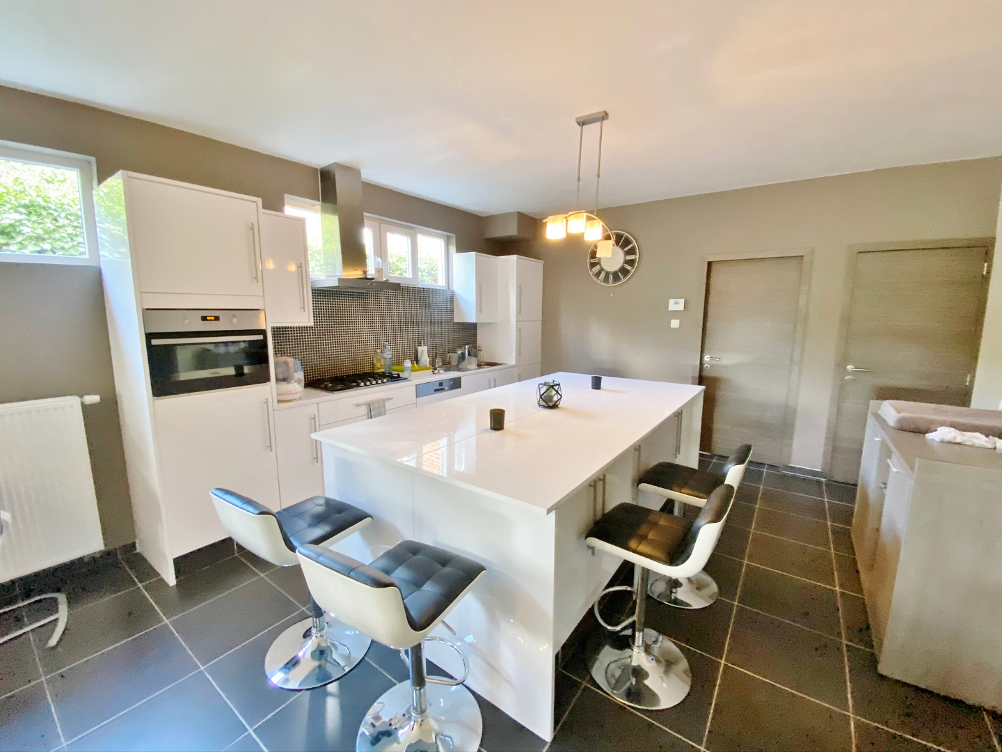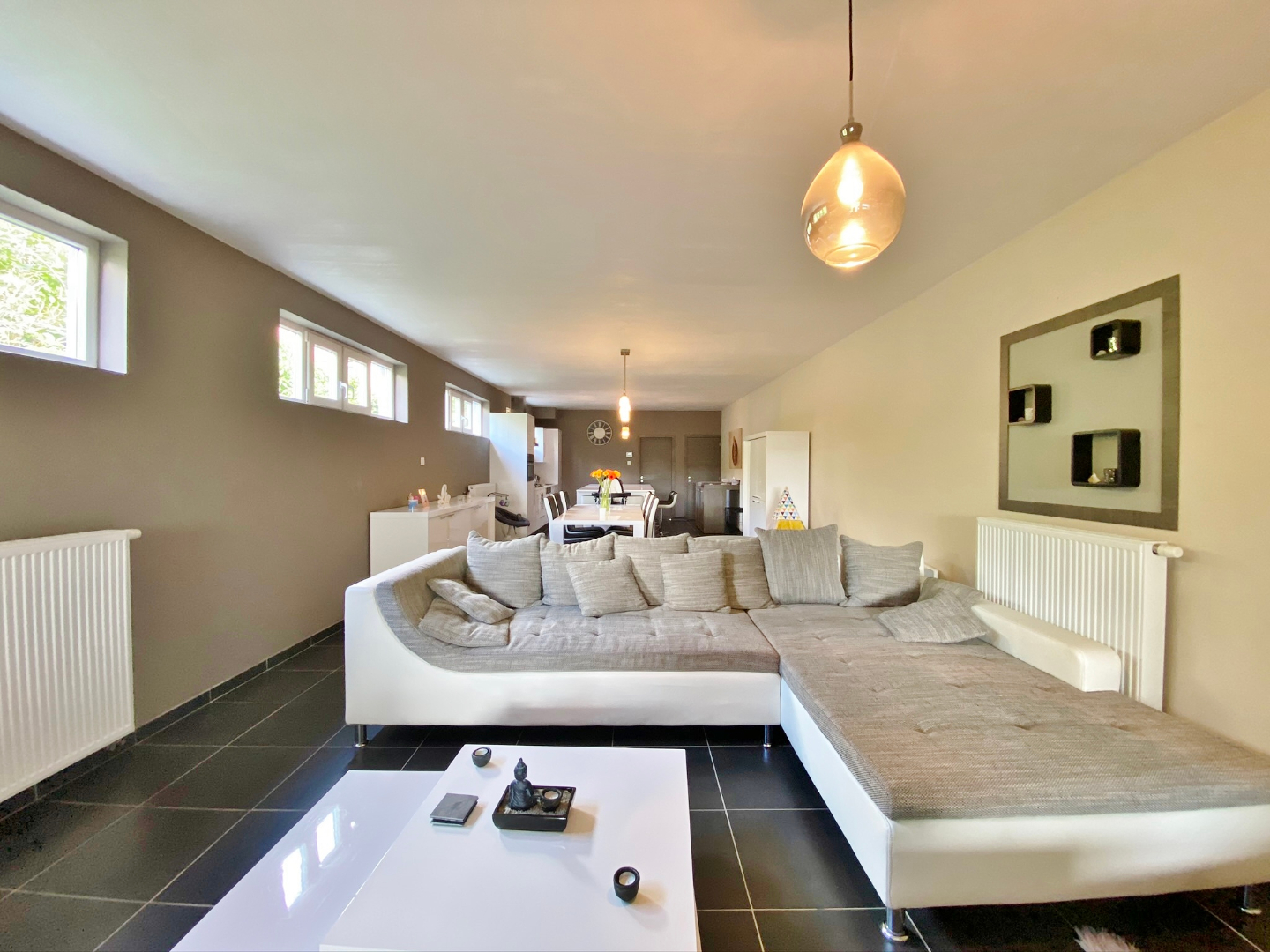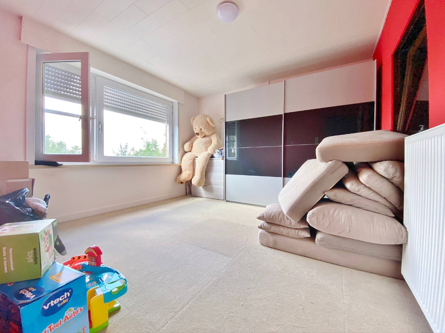 Deze verrassend ruime woning omvat een gelijkvloerse verdieping met inkom, apart toilet, garage met extra bergruimte en aansluiting voor wasmachine, ruime leefruimte met eet-en zitplaats en open volledig ingerichte keuken. Op het eerste verdiep zijn 2 ruime slaapkamers en een badkamer met douche, ligbad en lavabomeubel. Op het tweede verdiep zijn 2 extra kamers. Buiten is een gezellige zuid-gerichte tuin met terras, jacuzzi, ruime berging en ingebouwde BBQ.
