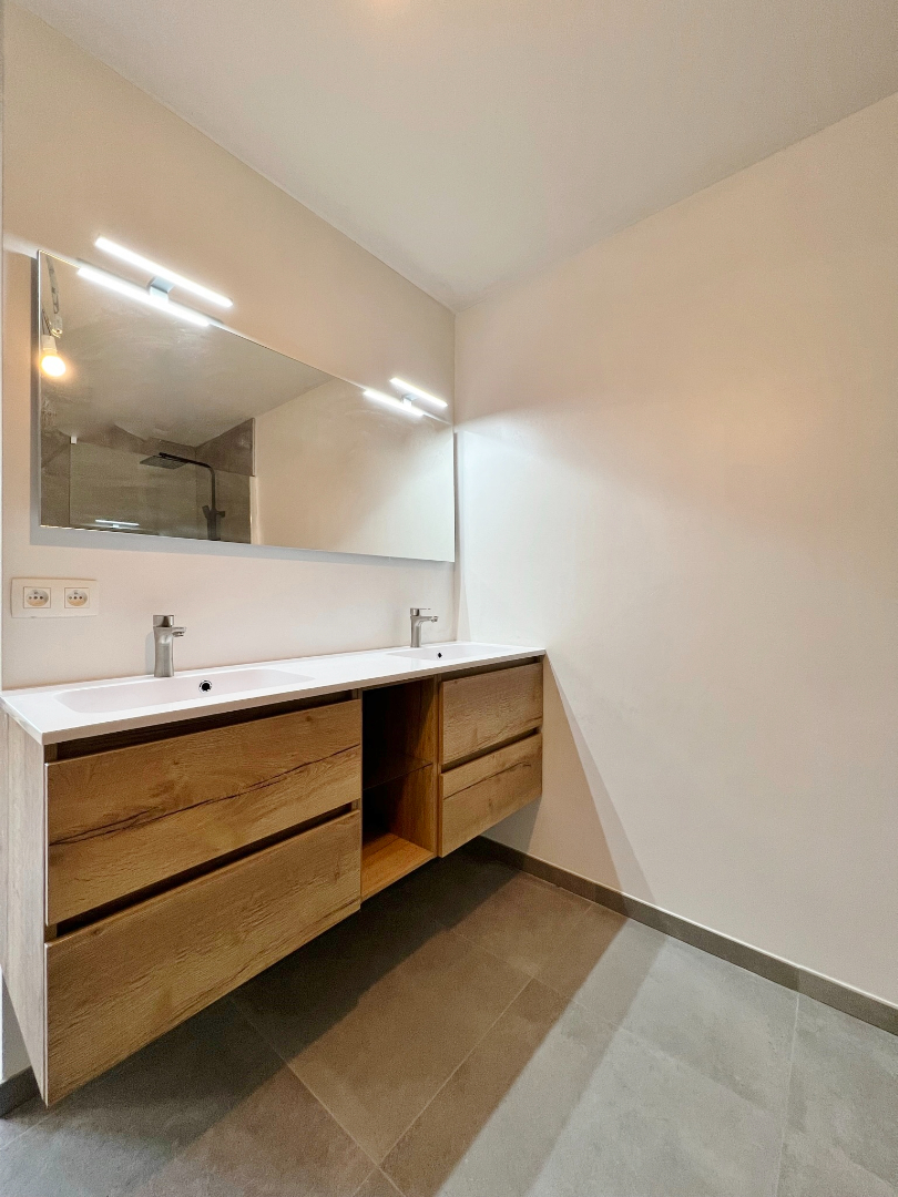 Tot slot zijn er op de gelijkvloers nog een badkamer (bad, douche, dubbele lavabo), berging en wasplaats. Vanuit de keuken en bergruimte is er toegang tot de zonnige afgesloten tuin.