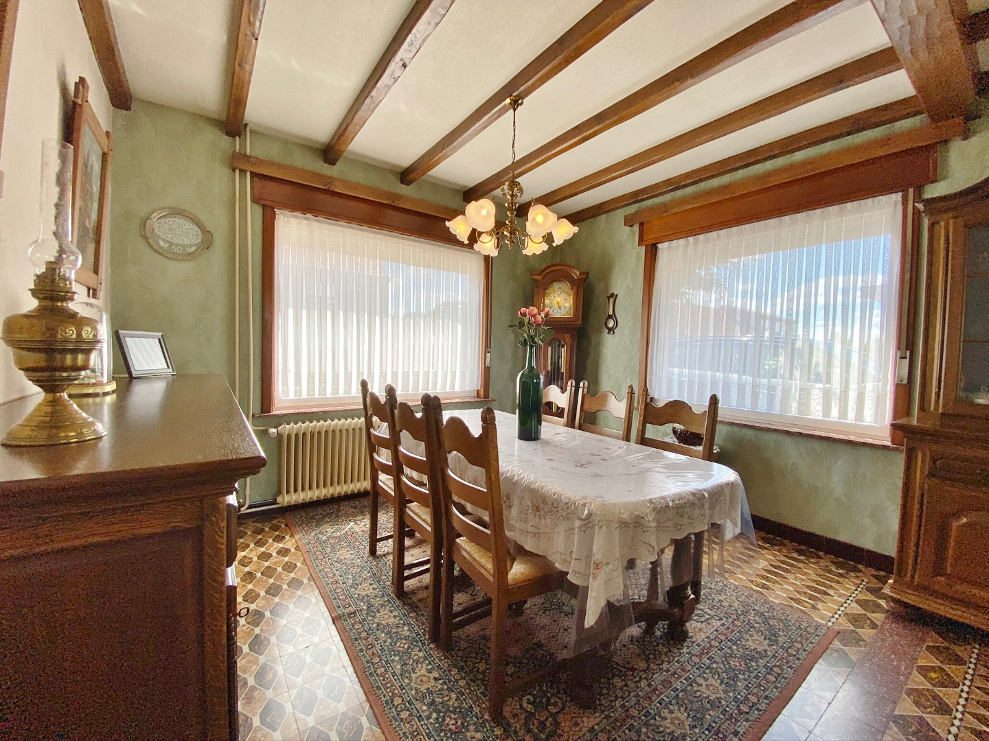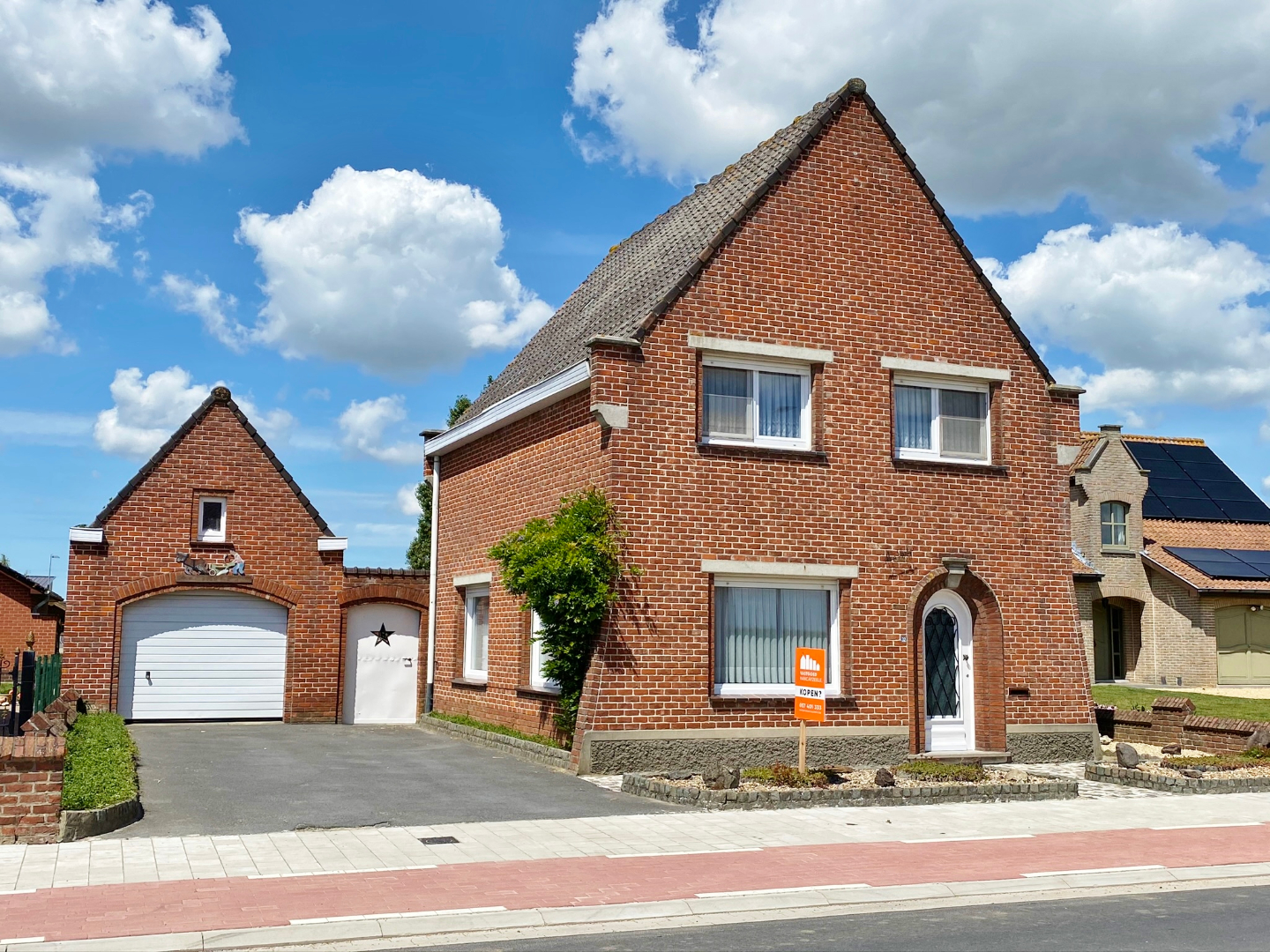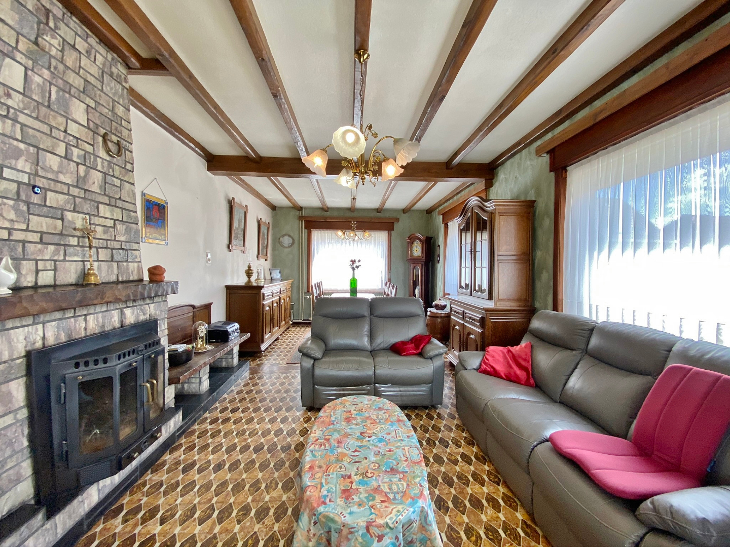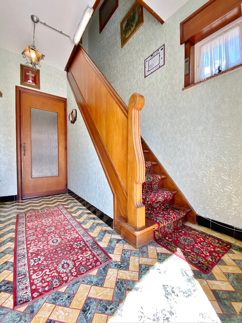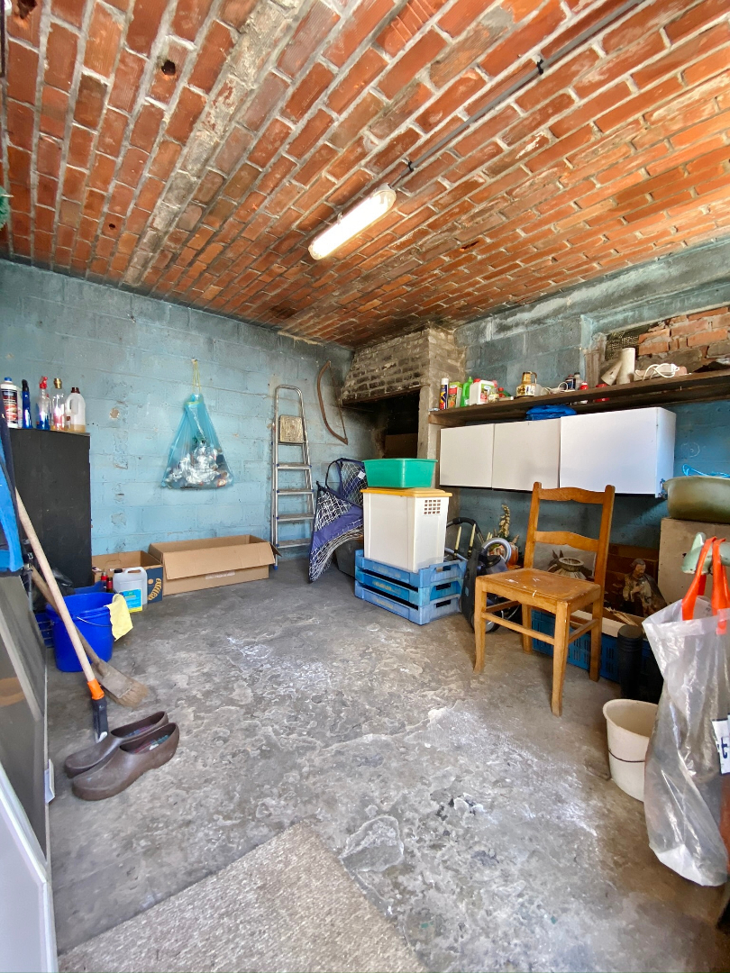 Op te frissen woonhuis bestaande uit een gelijkvloerse verdieping met inkom, ruime lichtrijke leefruime, eetplaats, keuken, veranda, slaapkamer en badkamer met douche, lavabomeubel en toilet. Op het eerste verdiep zijn 3 ruime slaapkamers en een toilet. Buiten is een grote volledig afgesloten tuin met verschillende buitenbergingen en een ruime garage met sectionale poort.